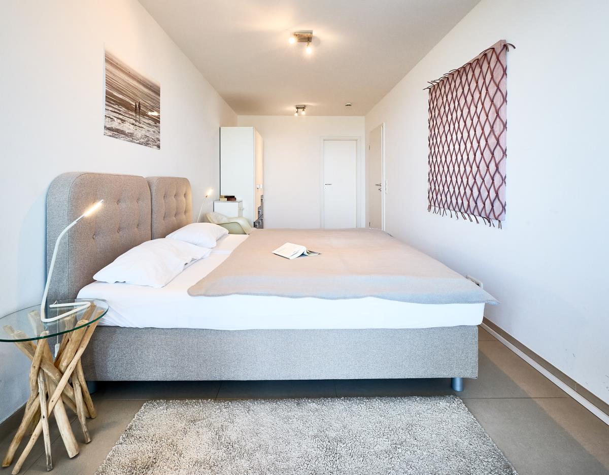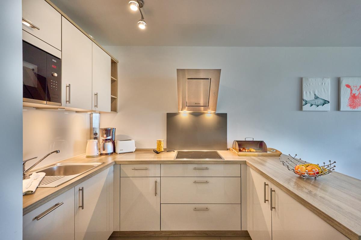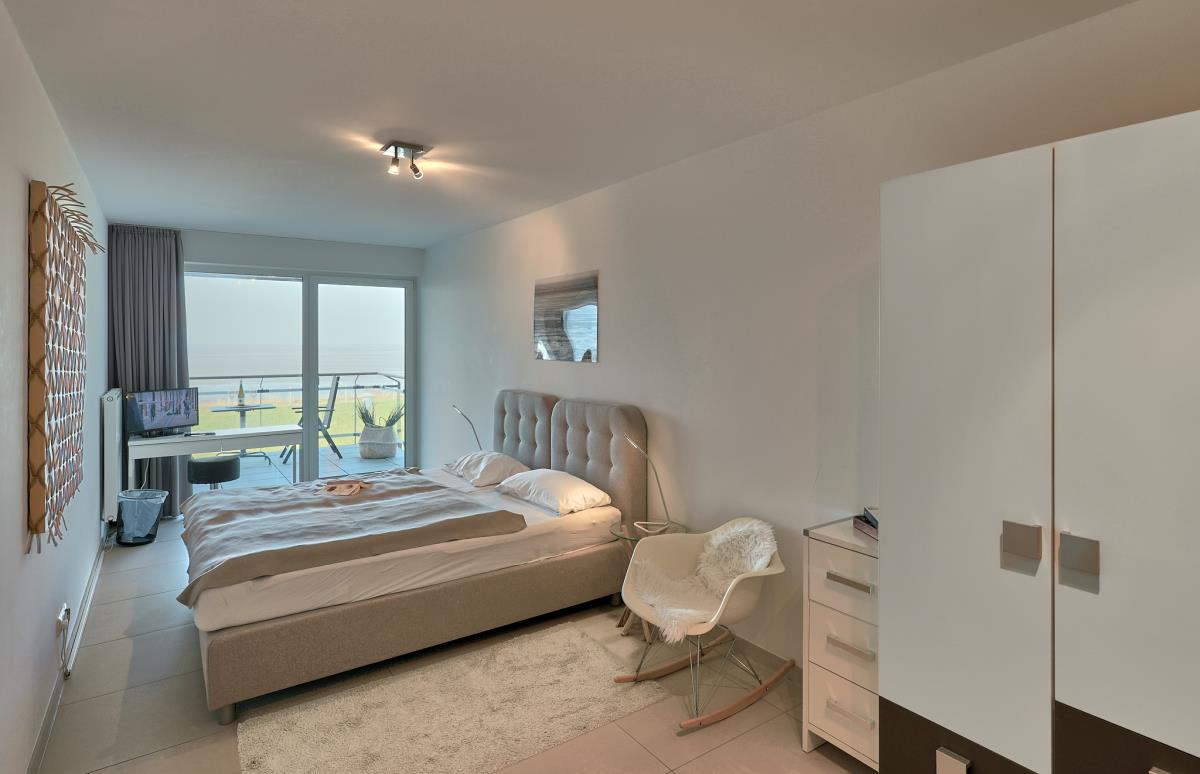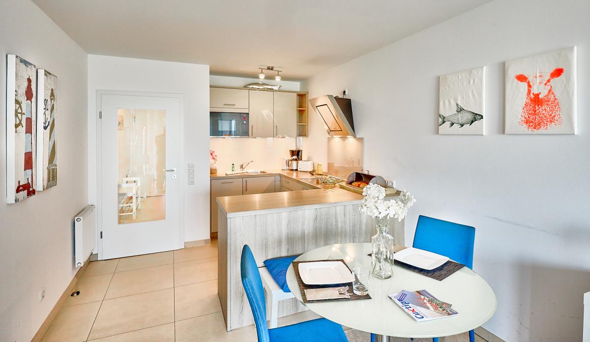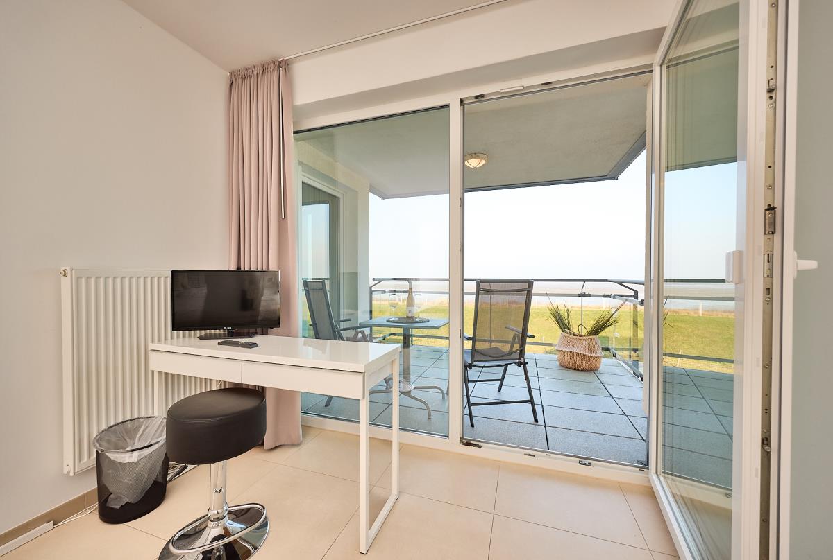 Die Wohnung verfügt über eine moderne Küchenzeile sowie ein separates Schlafzimmer mit einem komfortablen Doppelbett (180 × 200 cm). Ein besonderes Highlight ist der Schreibtisch mit direktem Meerblick, ideal für Gäste, die auch im Urlaub gern lesen, arbeiten oder die vorbeiziehenden Schiffe beobachten. Ein geräumiger Kleiderschrank und eine praktische Abstellkammer bieten zusätzlichen Stauraum.