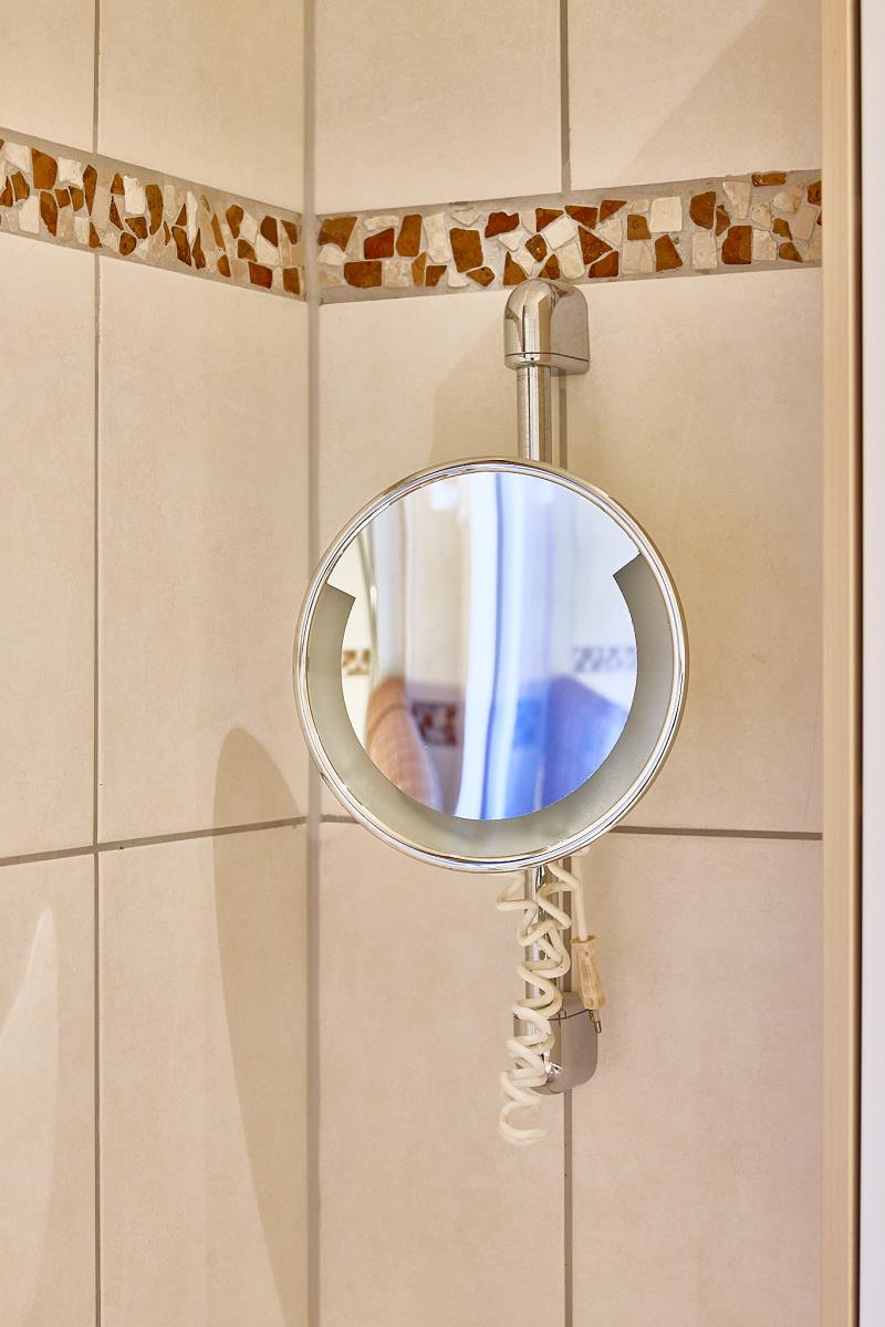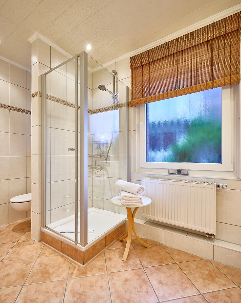 Das moderne Badezimmer überzeugt mit einer Badewanne, einer separaten Dusche, einem WC und einem großzügigen Waschtisch – ideal für Gäste, die Wert auf Komfort und viel Platz legen.