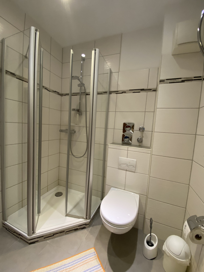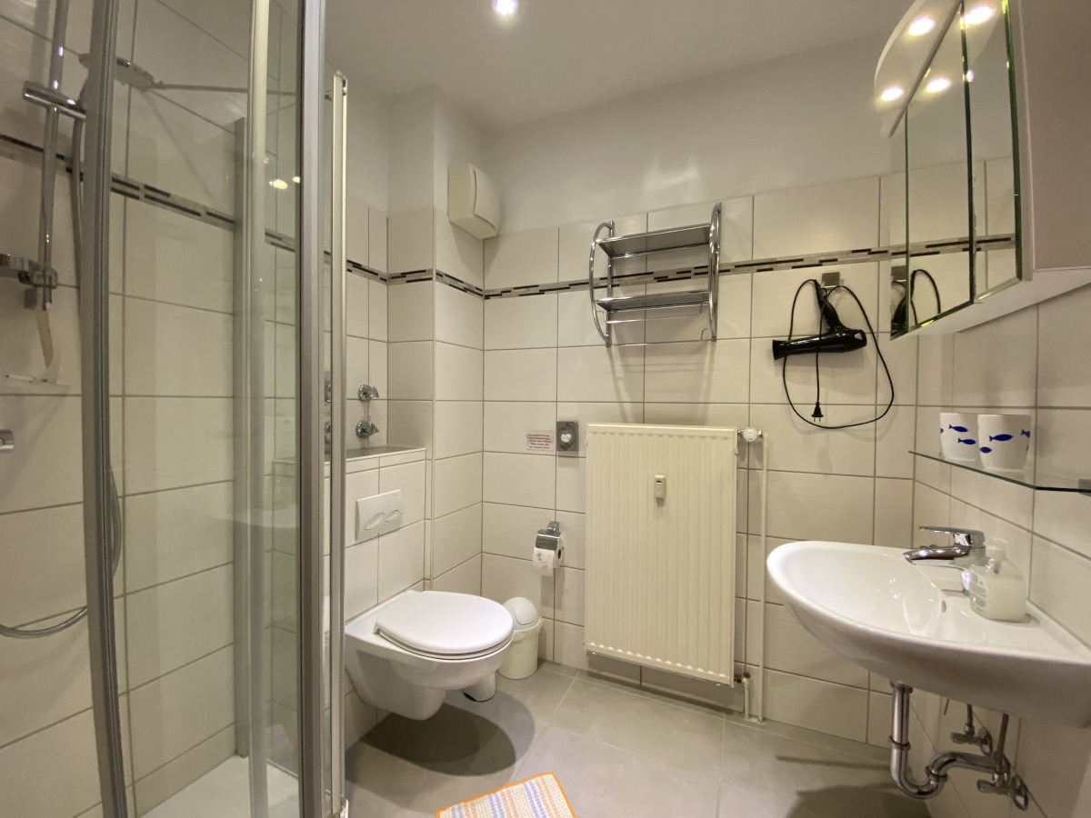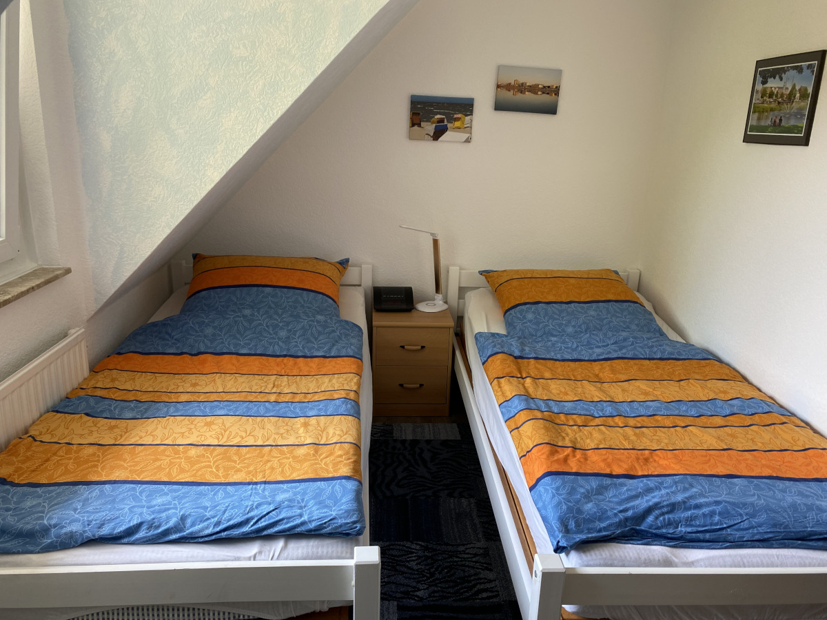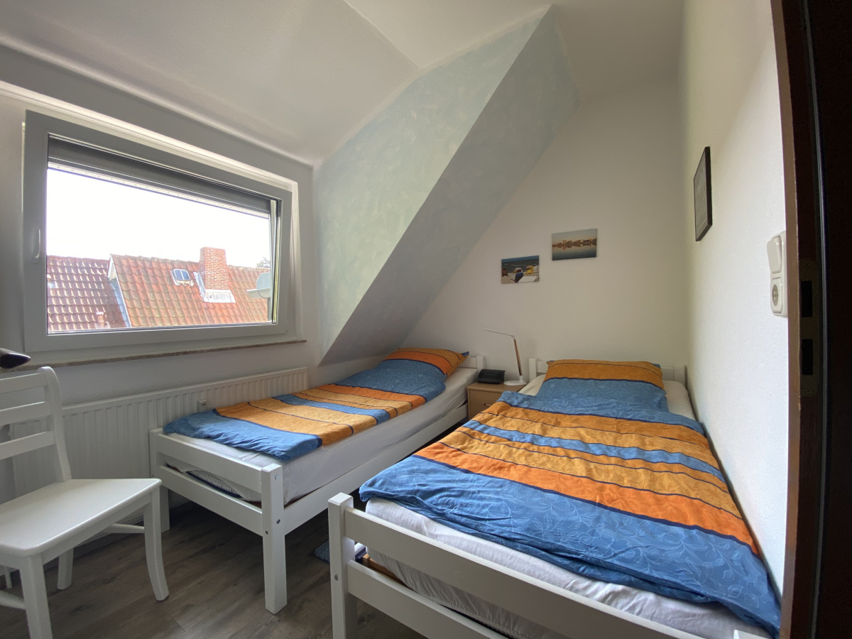 Das Schlafzimmer ist mit zwei getrennt stehenden Einzelbetten (90 x 200 cm) ausgestattet und bietet eine ruhige Rückzugsmöglichkeit. Das große Duschbad mit WC ist komfortabel und modern gestaltet. Ein Flur sowie ein kleiner Abstellraum sorgen für zusätzlichen Stauraum und Ordnung.