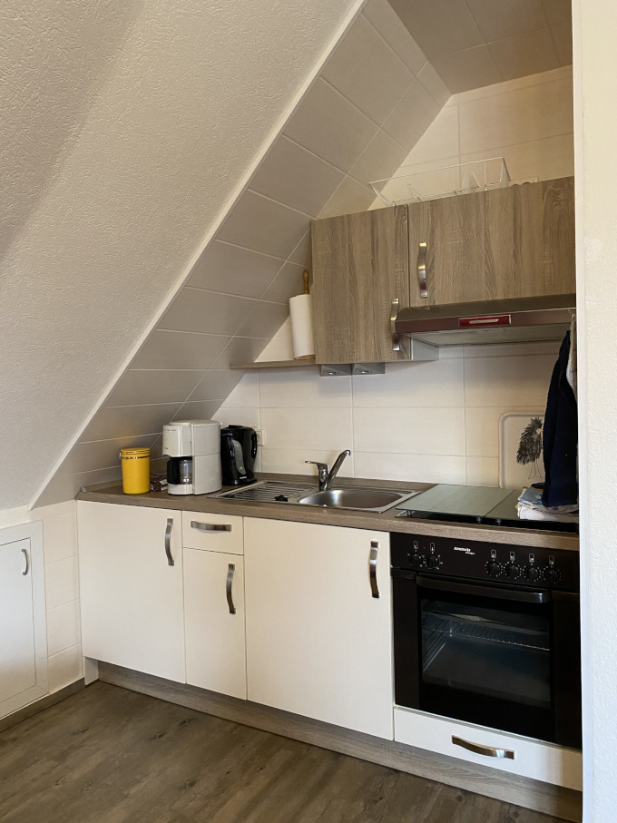 Auf 42 m² Wohnfläche bietet die Wohnung eine durchdachte Raumaufteilung und Platz für bis zu 4 Personen. Der Wohnbereich ist gemütlich gestaltet und verfügt über eine integrierte Küchenzeile, die alles bietet, was Sie für die Selbstversorgung im Urlaub benötigen. Zusätzlich befindet sich hier eine breite Doppelschlafcouch, die zwei weitere Schlafplätze bietet.