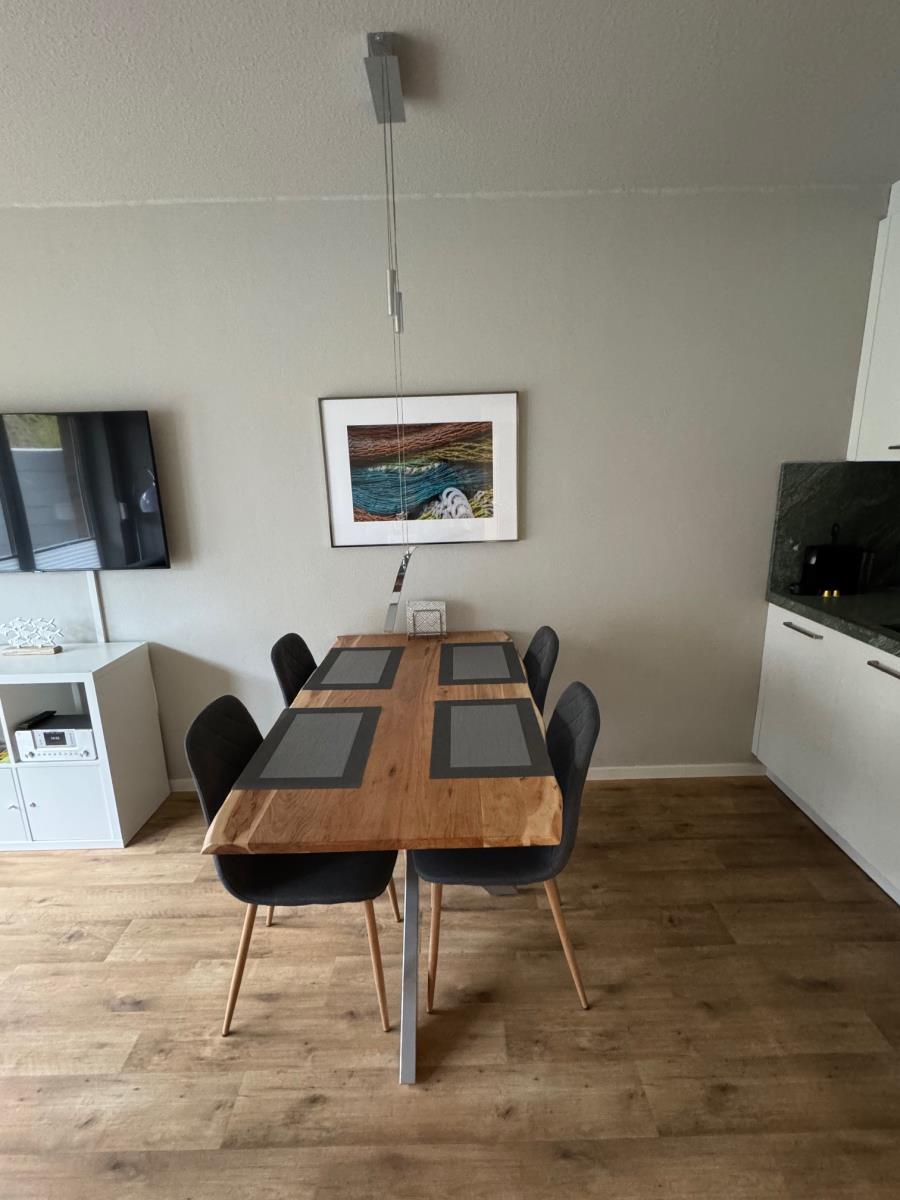 Der helle Wohnbereich verfügt über eine gemütliche Sitzecke mit Sofa, Smart‑TV, Radio sowie einen Esstisch mit vier Stühlen. Die angrenzende offene Küchenzeile ist hochwertig ausgestattet und bietet alles, was Sie für einen komfortablen Aufenthalt benötigen:
