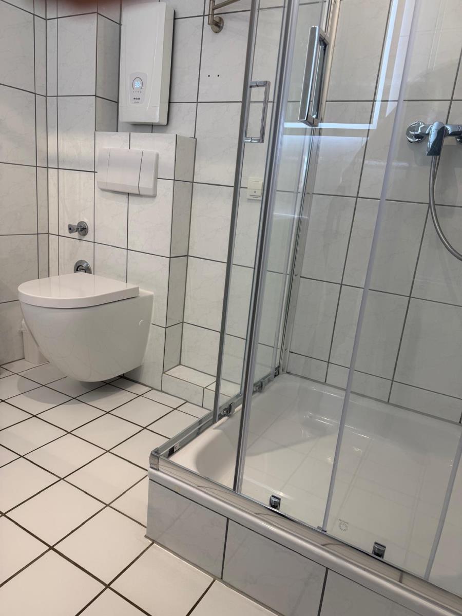 Das moderne Duschbad ist ausgestattet mit Dusche, Waschbecken, WC und Haartrockner.