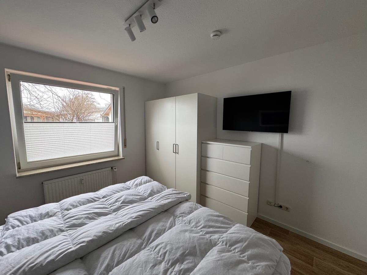 Das separate Schlafzimmer bietet ein komfortables Boxspringbett (180 × 200 cm), einen geräumigen Kleiderschrank mit Kleiderbügeln, eine Kommode, zwei Nachttische sowie einen Smart‑TV. Für angenehme Nächte sorgen Rolläden, Sichtschutz‑Plissees und Insektenschutz.