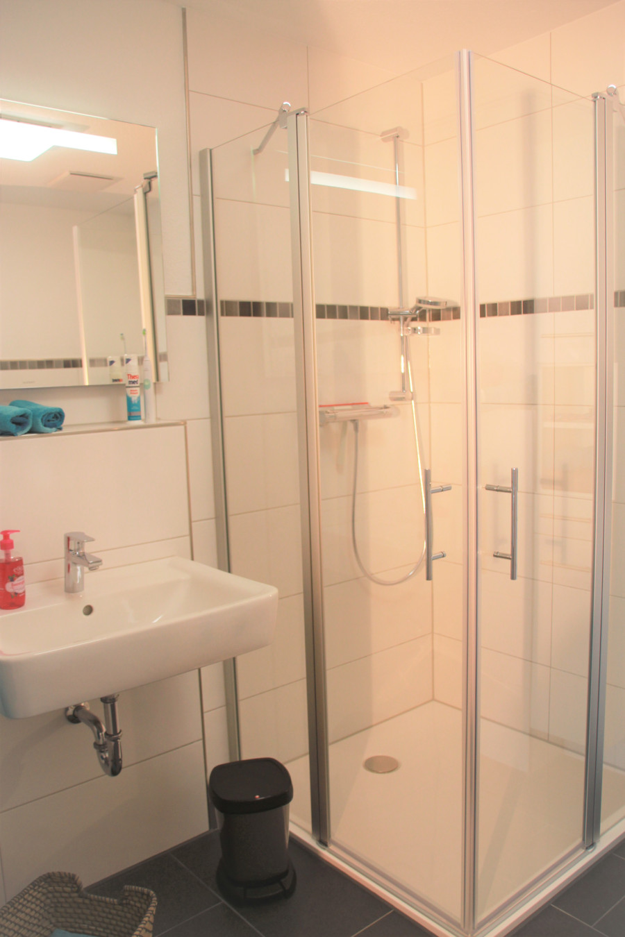 Das Penthouse bietet zwei separate Schlafzimmer, die jeweils mit einem gemütlichen Doppelbett eingerichtet sind. Besonders familienfreundlich ist eines der Schlafzimmer, das zusätzlich mit einem Babybett, einer Wickelkommode und einem Fläschchenwärmer ausgestattet ist – perfekt für Gäste mit Kleinkindern. Zwei moderne Badezimmer mit Dusche und WC bieten ausreichend Privatsphäre und Komfort für mehrere Personen.