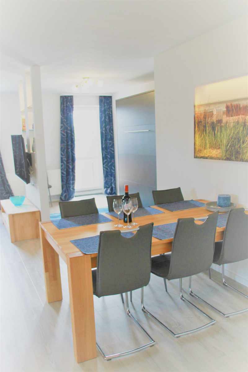 Die Wohnung 11 in der Villa Döser Strand ist ein großzügiges und modern ausgestattetes 3‑Raum Penthouse‑Apartment im 2. Obergeschoss und bietet mit Platz für bis zu 7 Personen die ideale Unterkunft für Familien, Freunde oder größere Gruppen, die einen komfortablen Nordseeurlaub in Cuxhaven-Döse verbringen möchten. Das helle und einladende Wohn-Esszimmer verfügt über einen separaten Essbereich sowie ein praktisches Schrankbett, das zusätzlichen Schlafraum schafft. Die vollständig ausgestattete Küche lässt keine Wünsche offen: Backofen, Wasserkocher, Kaffeemaschine, Spülmaschine und sogar eine Waschmaschine sorgen für maximalen Komfort während Ihres Aufenthalts.
