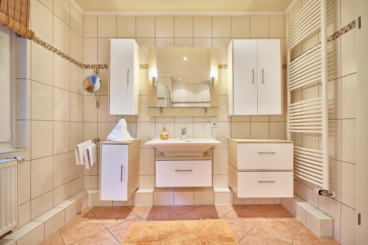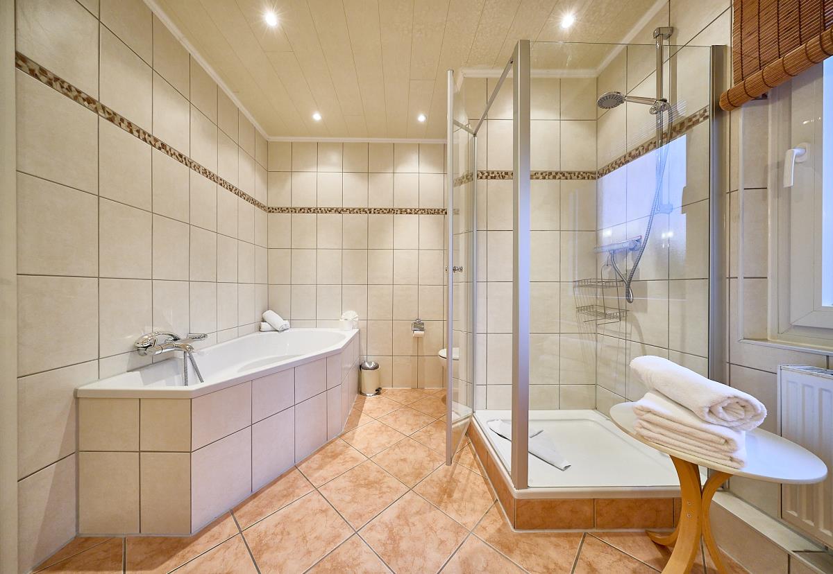 Das moderne Badezimmer überzeugt mit einer Badewanne, einer separaten Dusche, einem WC und einem großzügigen Waschtisch – ideal für Gäste, die Wert auf Komfort und viel Platz legen.