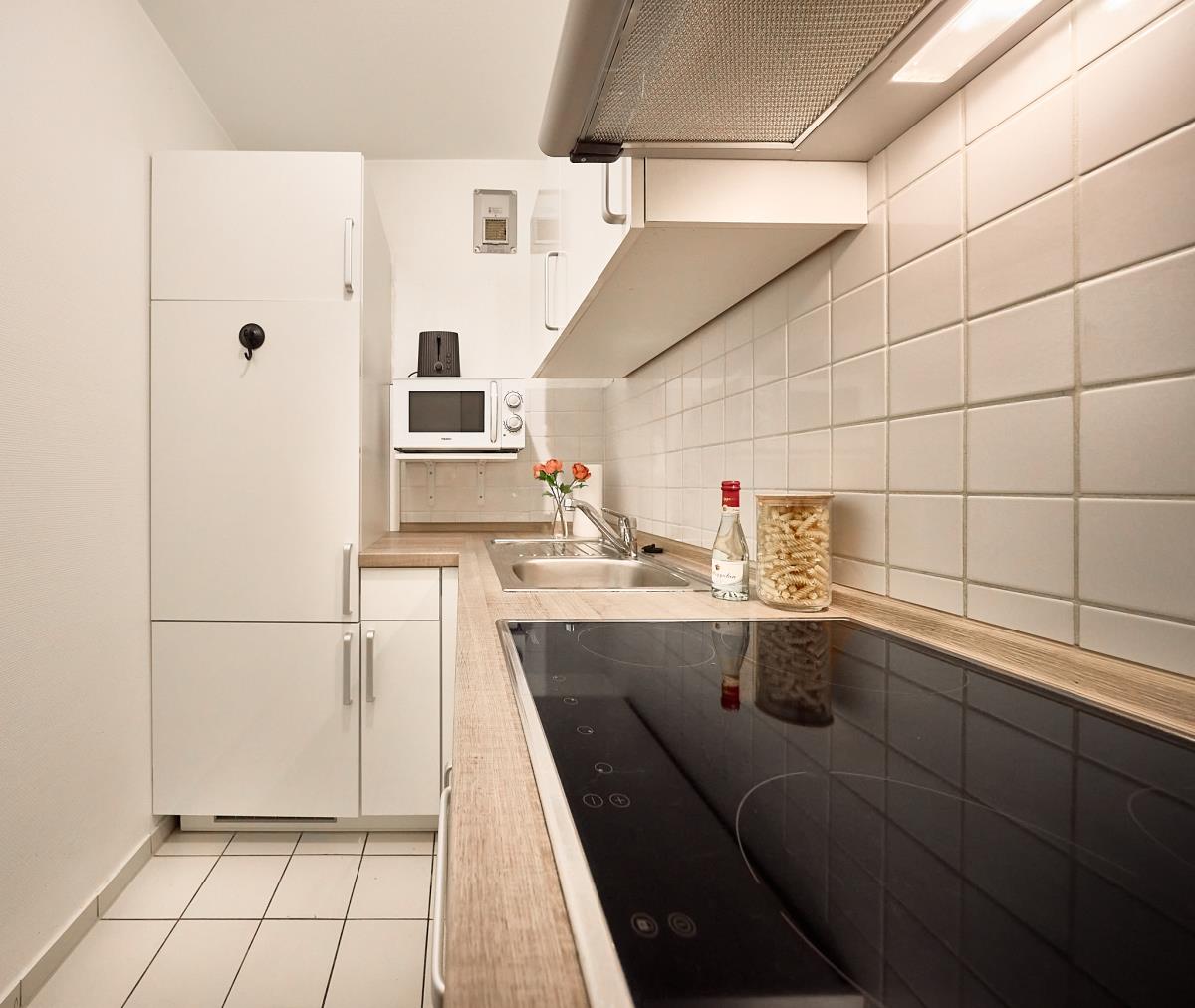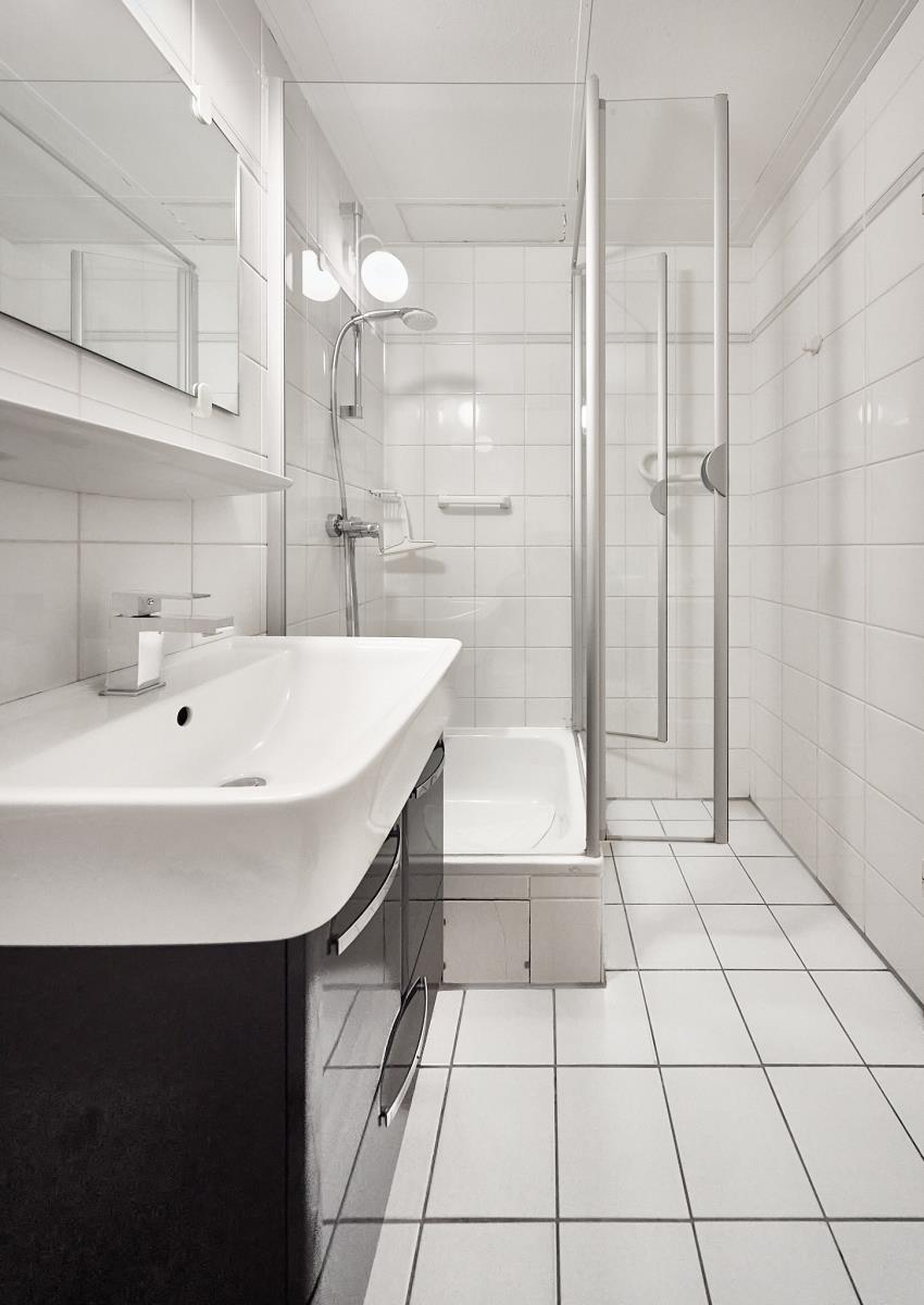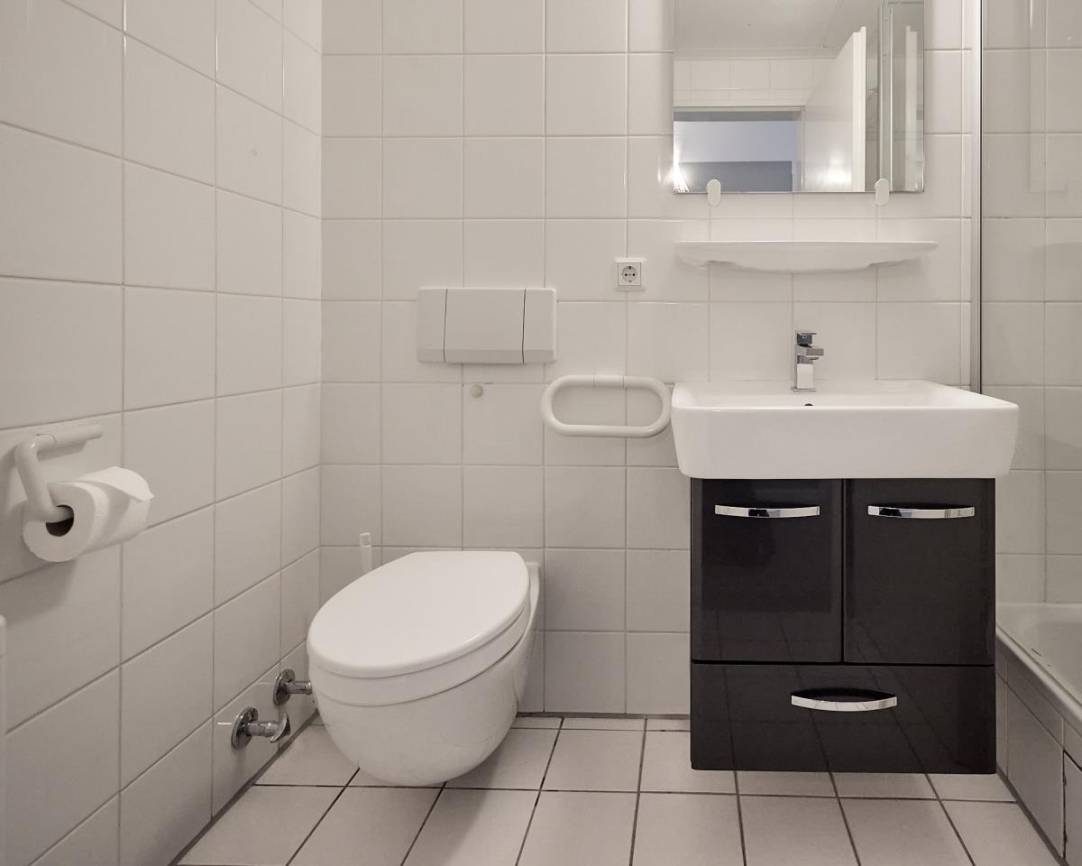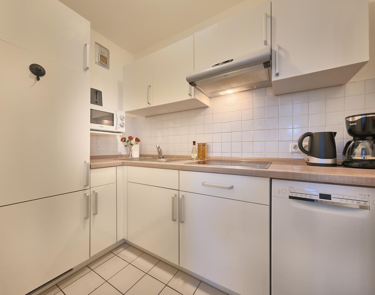 Die separate Küche ist praktisch eingerichtet und bietet alles, was Sie für die Selbstversorgung benötigen. Das moderne Badezimmer rundet den frischen Gesamteindruck der Wohnung ab.