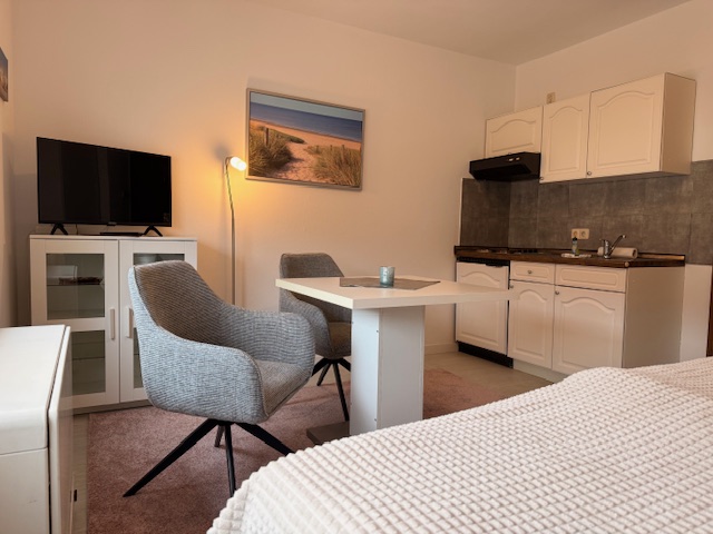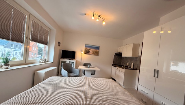 Die kleine, aber äußerst charmante Ferienwohnung 4 im Haus Nicole in Cuxhaven Duhnen befindet sich im Erdgeschoss und bietet auf 28 m² eine liebevoll eingerichtete Unterkunft für Gäste, die eine gemütliche, strandnahe und ruhige Ferienwohnung suchen. Der kombinierte Schlaf‑ und Essbereich ist mit einem hochwertigen Boxspringbett ausgestattet, das dem Raum eine besonders warme und einladende Atmosphäre verleiht. Hier können Sie entspannen, zur Ruhe kommen und Ihren Urlaub an der Nordsee in vollen Zügen genießen.