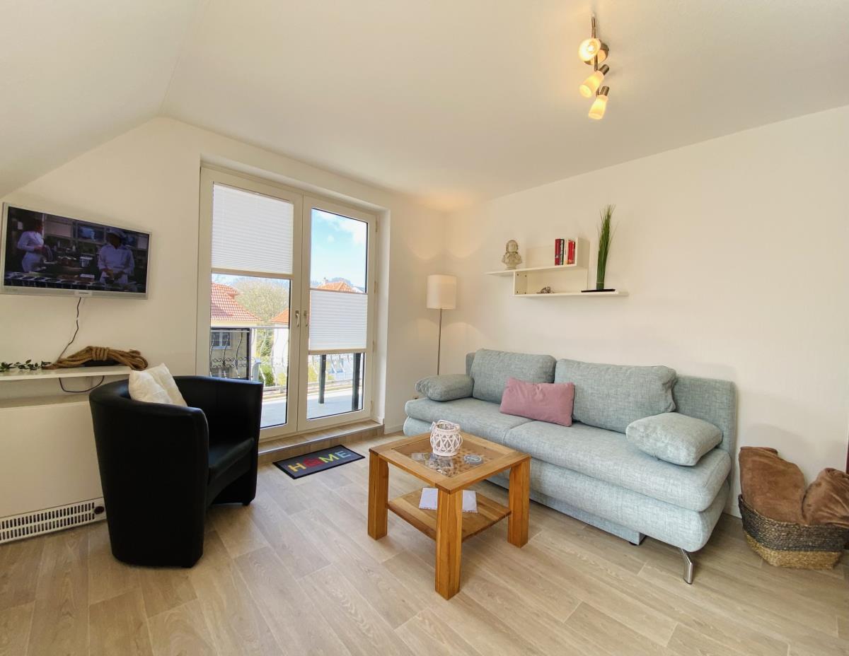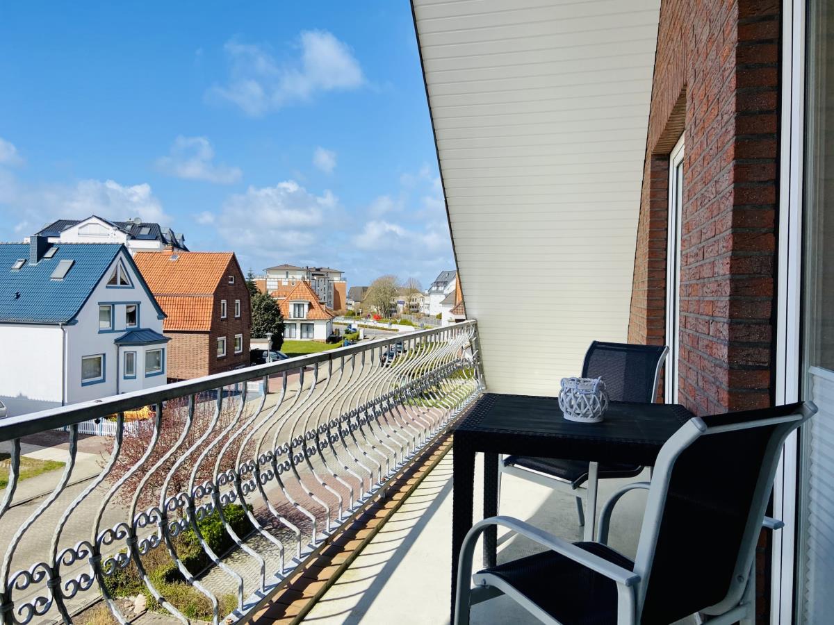Die gemütliche und großzügige Ferienwohnung 5 im Haus Nicole in Cuxhaven Duhnen befindet sich im Dachgeschoss (2. Etage) und bietet auf 50 m² ein komfortables Zuhause für einen erholsamen Urlaub an der Nordsee. Ein besonderes Highlight dieser Wohnung ist der große Balkon, der sowohl vom Wohnzimmer als auch vom Schlafzimmer aus begehbar ist. Von hier aus genießen Sie einen schönen Blick Richtung See – perfekt für entspannte Stunden an der frischen Nordseeluft, ein Frühstück im Freien oder romantische Abendmomente.