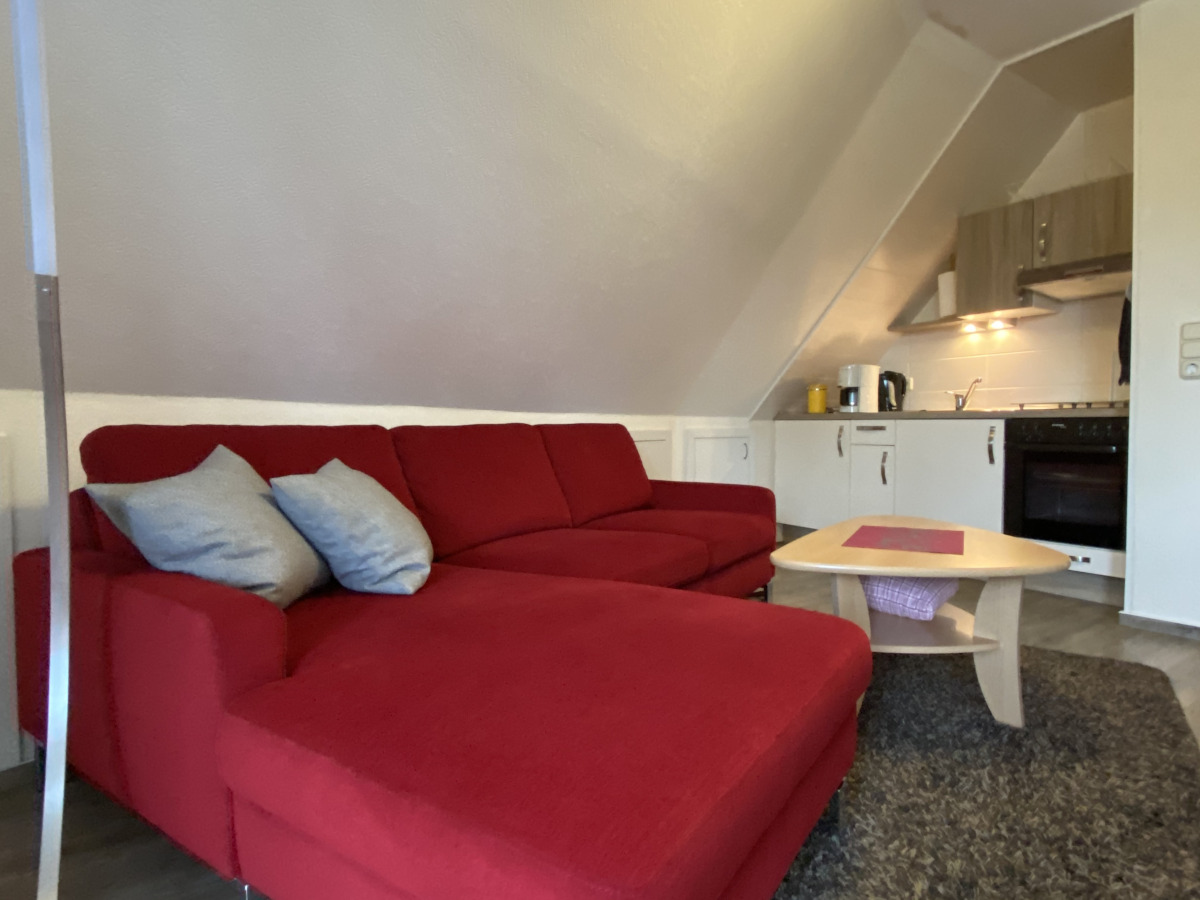 Auf 42 m² Wohnfläche bietet die Wohnung eine durchdachte Raumaufteilung und Platz für bis zu 4 Personen. Der Wohnbereich ist gemütlich gestaltet und verfügt über eine integrierte Küchenzeile, die alles bietet, was Sie für die Selbstversorgung im Urlaub benötigen. Zusätzlich befindet sich hier eine breite Doppelschlafcouch, die zwei weitere Schlafplätze bietet.