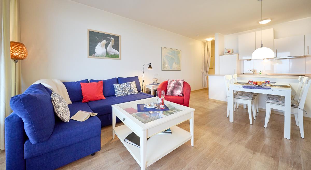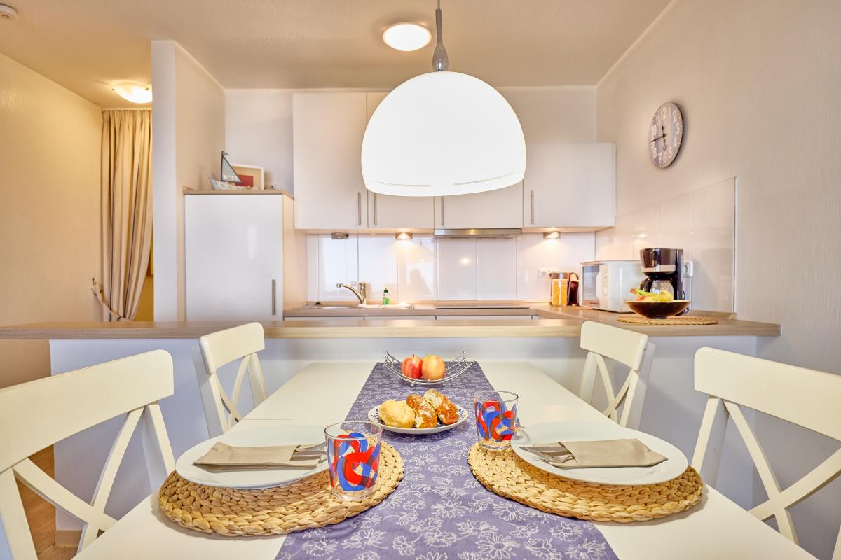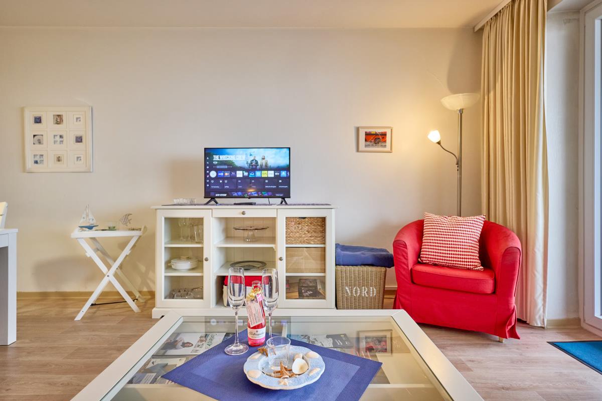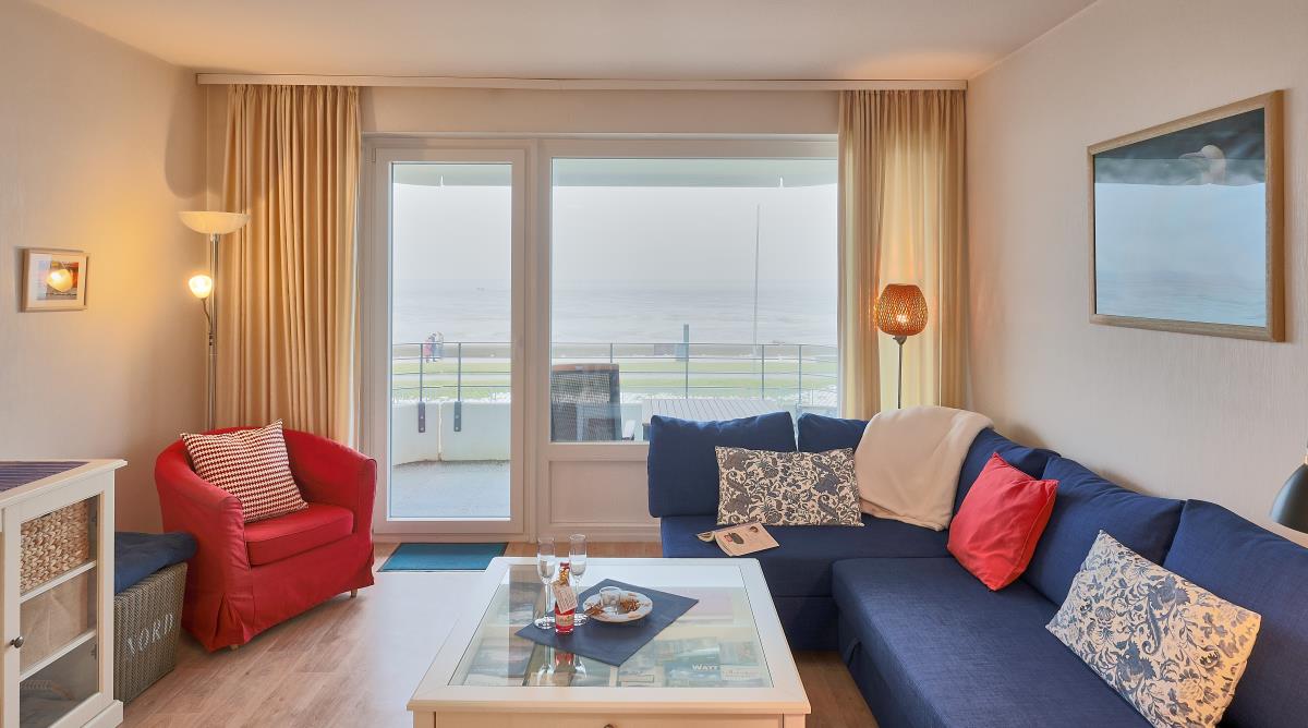 Der Wohnbereich ist gemütlich gestaltet und bietet direkten Zugang zum Balkon – ideal, um morgens den Sonnenaufgang über dem Wattenmeer oder abends die frische Nordseeluft zu genießen. Die Küchenzeile ermöglicht eine bequeme Selbstversorgung während Ihres Aufenthalts.