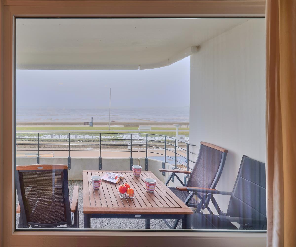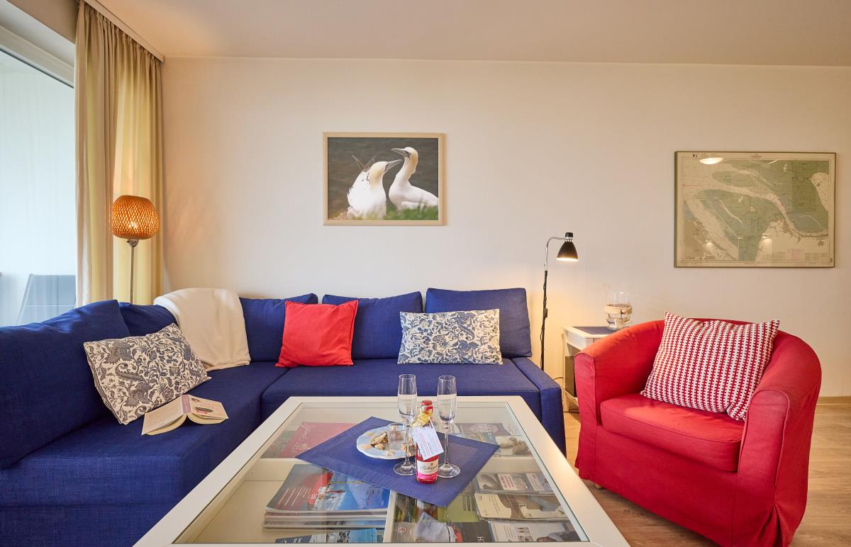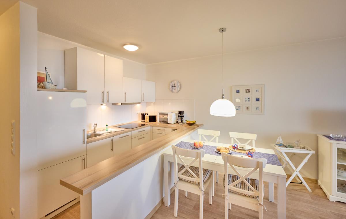 Der Wohnbereich ist gemütlich gestaltet und bietet direkten Zugang zum Balkon – ideal, um morgens den Sonnenaufgang über dem Wattenmeer oder abends die frische Nordseeluft zu genießen. Die Küchenzeile ermöglicht eine bequeme Selbstversorgung während Ihres Aufenthalts.
