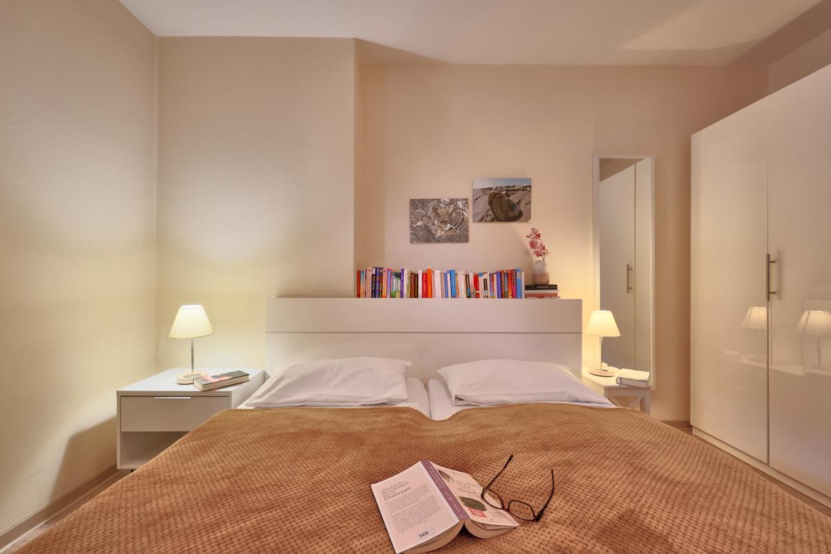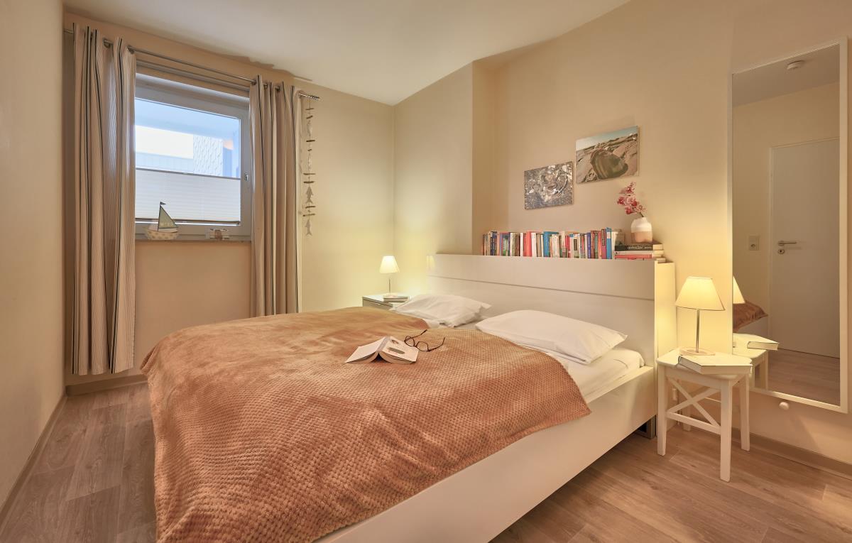 Die Wohnung verfügt über zwei Zimmer, eine praktische Küchenzeile, ein Badezimmer sowie einen Balkon, der zum Entspannen einlädt. Im Schlafzimmer erwartet Sie ein komfortables Doppelbett (180 x 200 cm), ergänzt durch Nachttische und einen Kleiderschrank, der ausreichend Stauraum für Ihre Urlaubsgarderobe bietet.