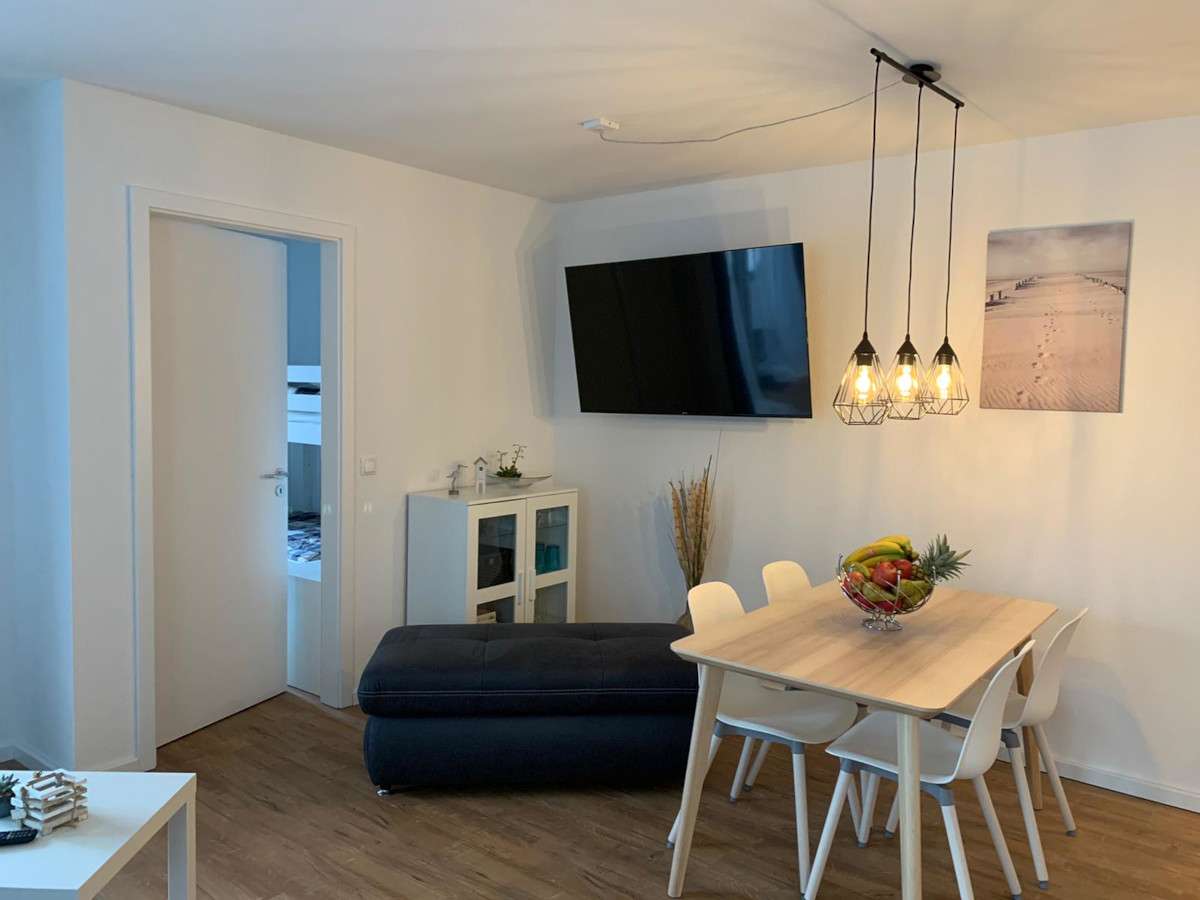 Der großzügige Wohn‑ und Essbereich lädt zum Ankommen und Wohlfühlen ein. Ein gemütliches Schlafsofa bietet bei Bedarf zusätzlichen Schlafplatz, während der separate Essbereich zu gemeinsamen Mahlzeiten einlädt. Die voll ausgestattete Küchenzeile mit Backofen, Spülmaschine, Wasserkocher, Kaffeemaschine und allen wichtigen Küchenutensilien macht das Kochen im Urlaub besonders angenehm. Selbstverständlich steht Ihnen kostenfreies WLAN zur Verfügung.