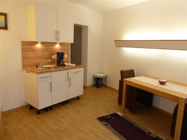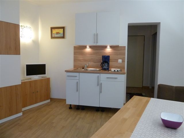 Eine gemütliche Sitzgelegenheit lädt sowohl zum entspannten Ausklingen des Tages als auch zum täglichen Frühstück ein. Die moderne Küchenzeile ist mit allen wichtigen Geräten ausgestattet und macht das Kochen im Urlaub besonders angenehm. Das Wannenbad bietet entspannte Badeerlebnisse und rundet die Ausstattung der Wohnung perfekt ab.