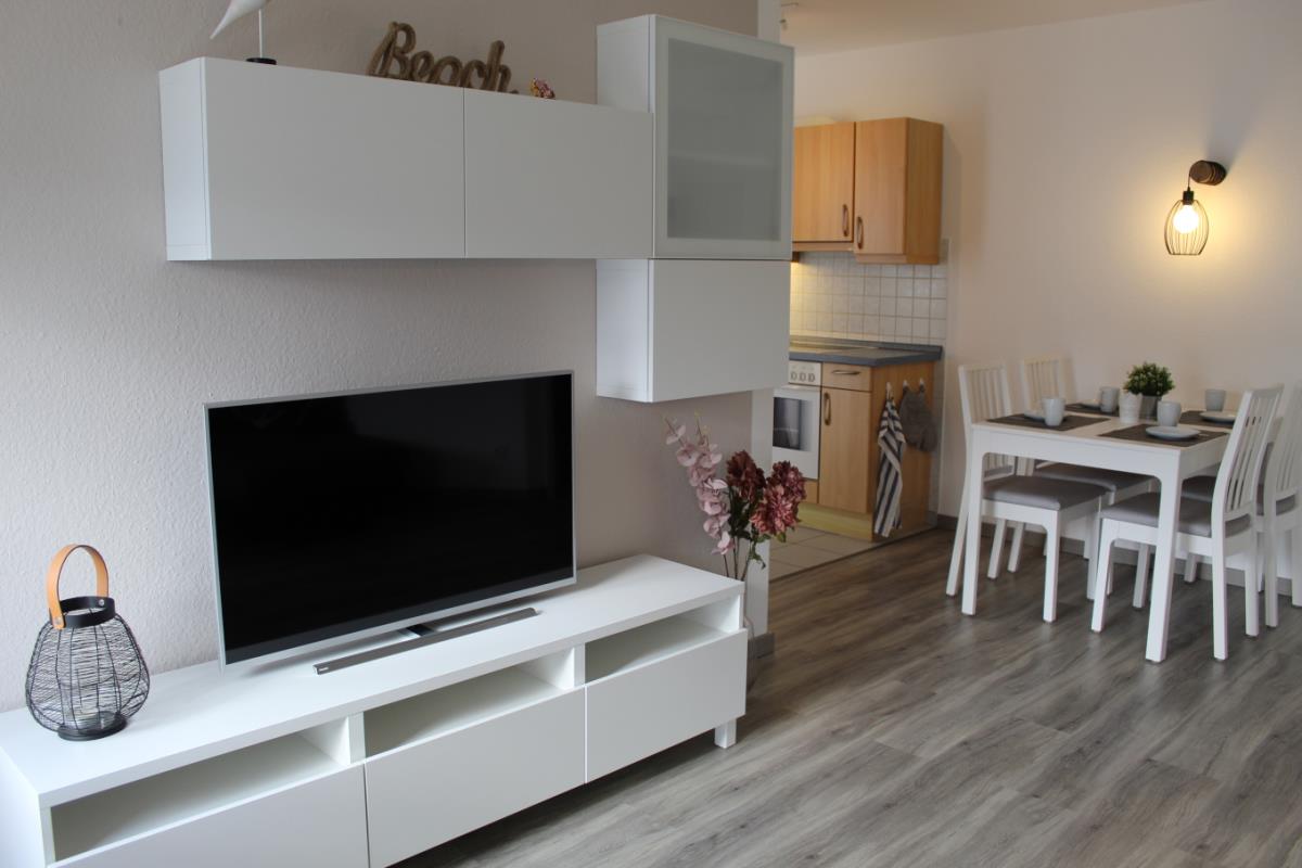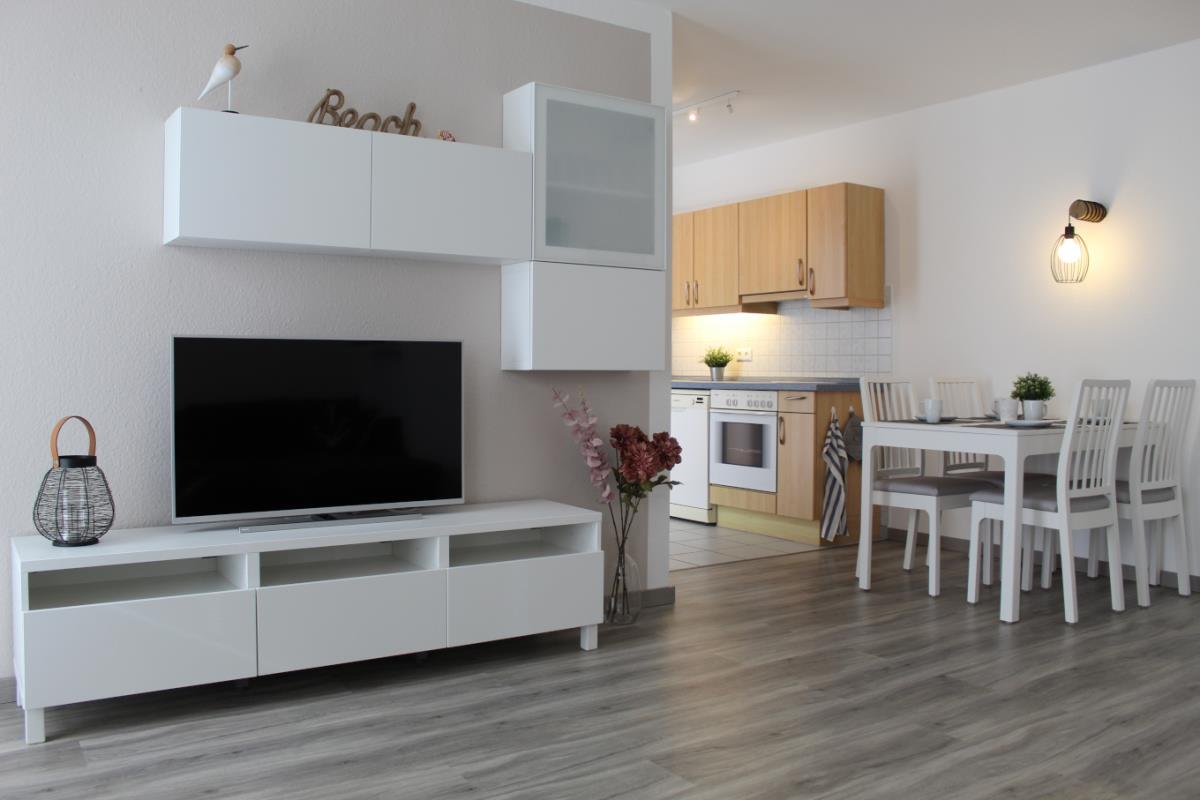 Der helle Wohn- und Essbereich bietet ein gemütliches Schlafsofa als zusätzliche Schlafmöglichkeit, einen Esstisch für vier Personen sowie eine vollständig ausgestattete Küchenzeile mit Cerankochfeld, Backofen, Mikrowelle, Kühlschrank mit Gefrierfach und allen wichtigen Küchenutensilien. Auch von diesem Raum aus betreten Sie den zweiten Balkon, der sich ideal für ein Frühstück im Freien oder einen ruhigen Abend eignet. Das großzügige Badezimmer ist modern und hell gestaltet und verfügt über eine Dusche, eine Badewanne, ein Waschbecken und ein WC.